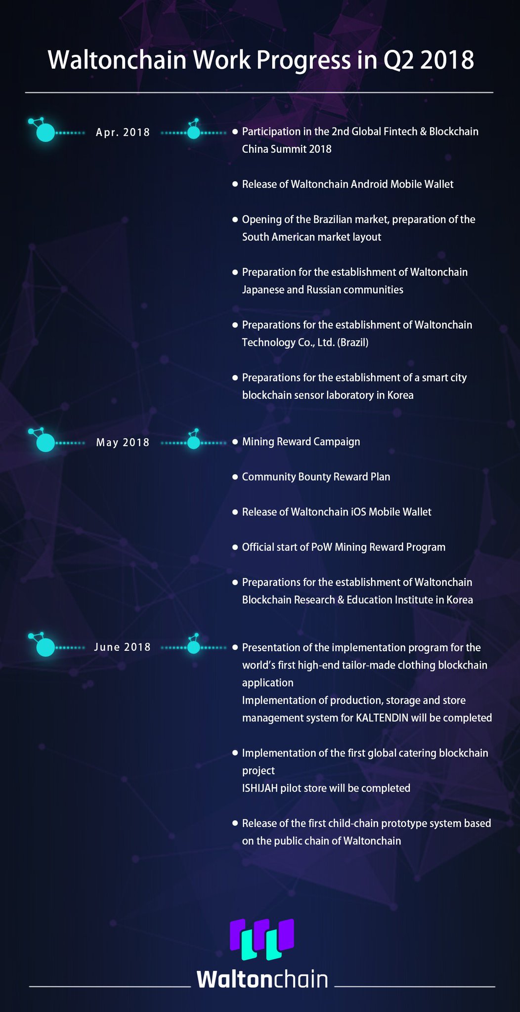 Even though Waltonchain is currently focusing on the Chinese retail apparel market, it has already set in motion other industries to expand to. The company recently released its planned Q2 2018 roadmap, where it announces that it intends to expand to Brazil, followed by laying the groundwork in Japan and Russia.